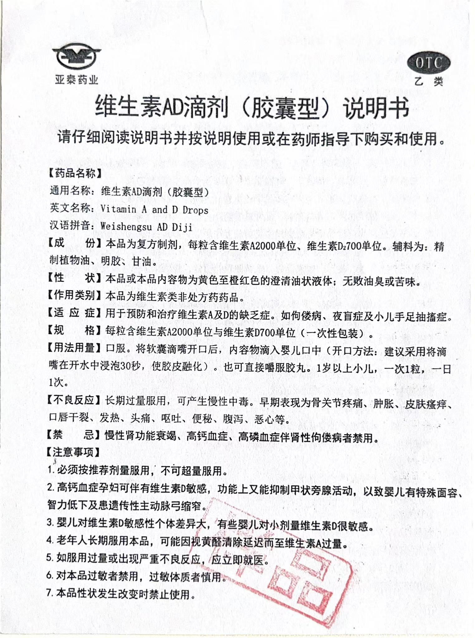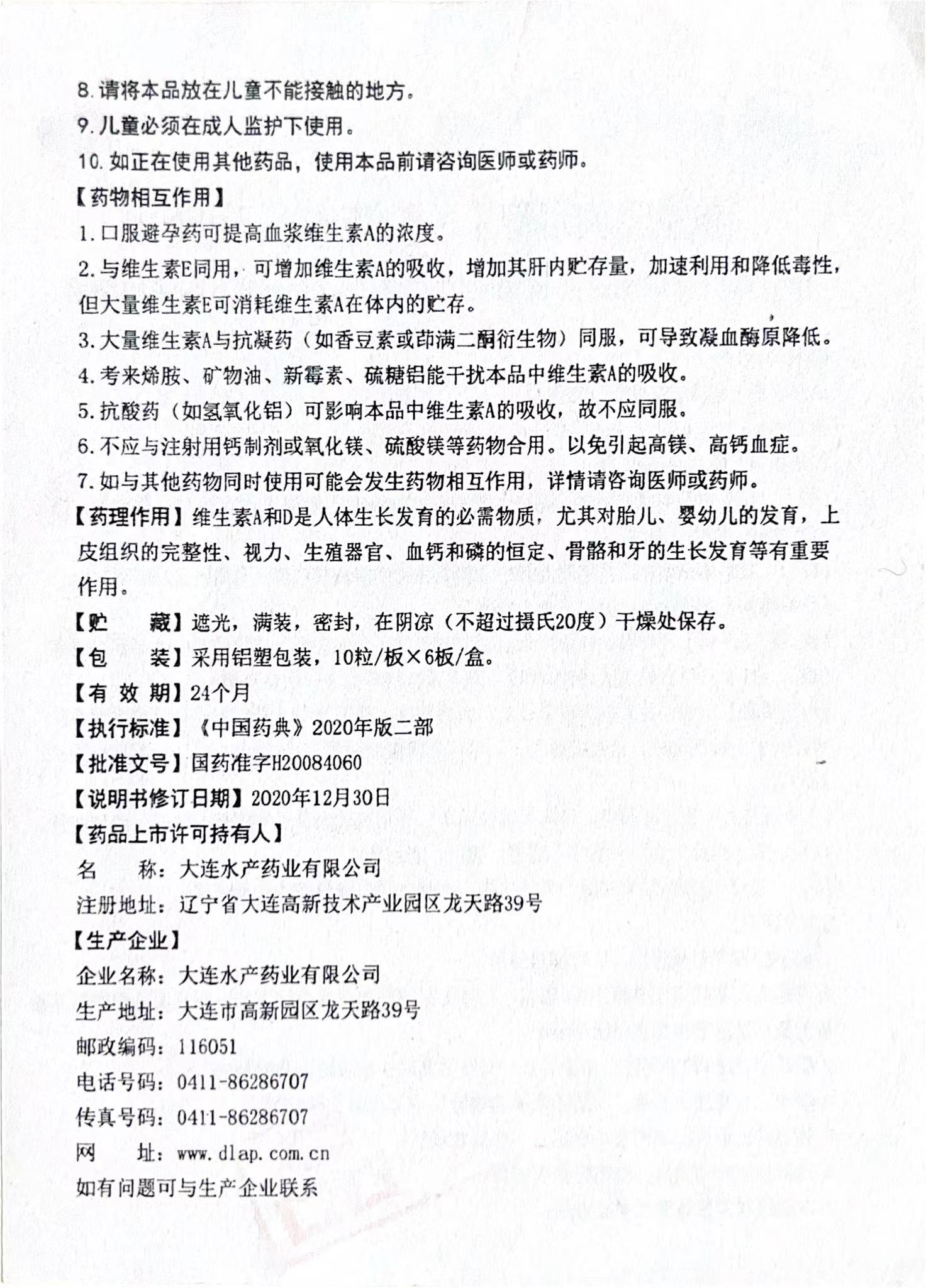 【規格】本品為復方制劑,每粒含維生素A2000單位、維生素D2700單位。輔料為:精制植物油、明膠、甘油。